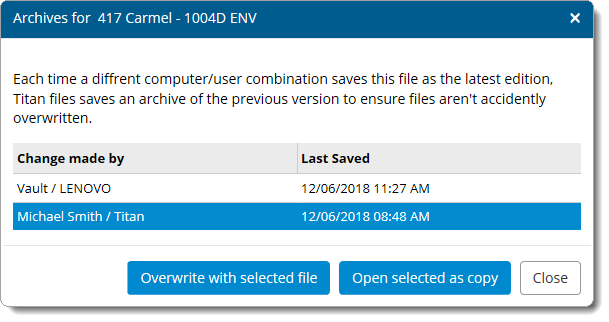 - The archive list displays each version of the file, the username and