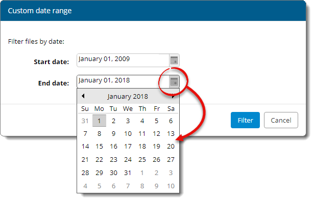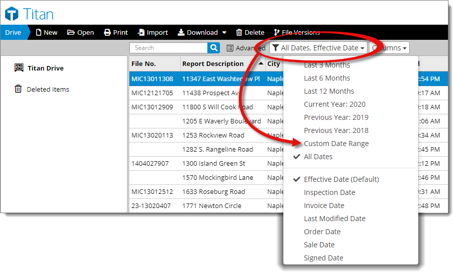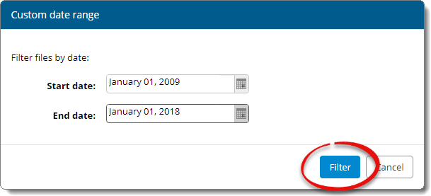 Rather than scrolling through hundreds or even thousands of files to find the file(s) you're looking for, use the filter drop‑down menu ( ) to quickly narrow down the list of files displayed to a specific period of time — such as the last 12 months, current year, previous year, or a custom date range. For instance, if you want to find and delete all of the older files that go beyond the five‑year USPAP requirement, here's how to do it: