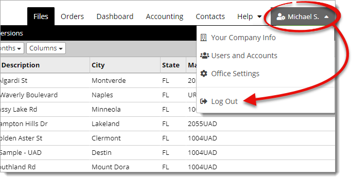 When you're ready to log out of Titan Drive, simply hover your cursor over the User Settings menu on the upper right and select Log Out from the drop‑down menu.
