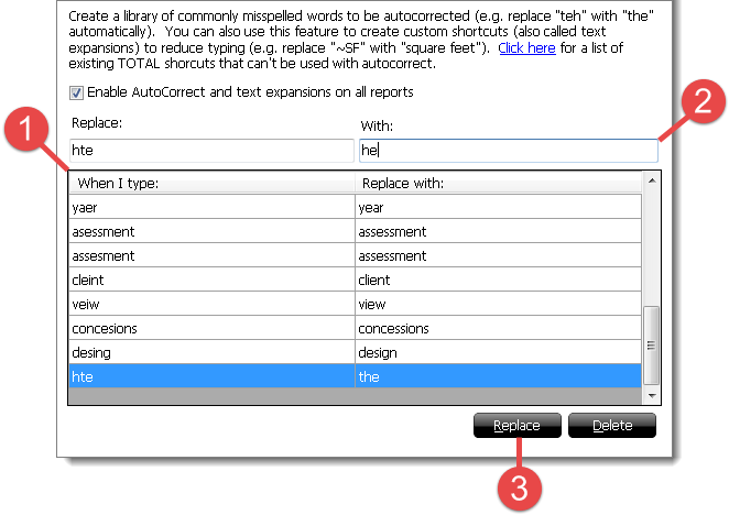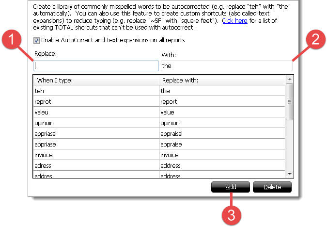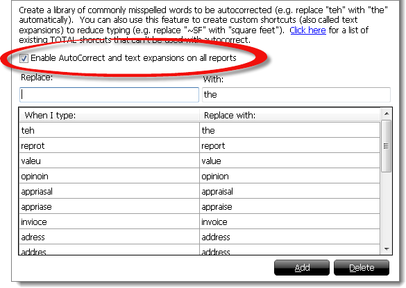 AutoCorrect allows TOTAL to automatically replace misspelled words as you