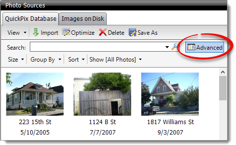 To delete old photos, click the Advanced button to search a range of photos by date taken. Alternatively, click Sort and choose Date Taken and Ascending. This organizes your photos starting with the oldest at the top.