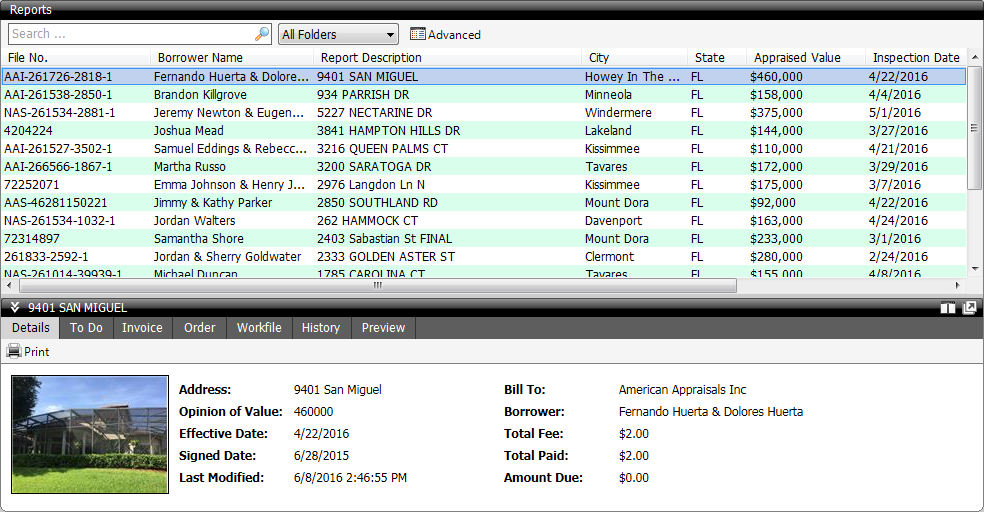 The Details tab in the Info Pane gives you insight into the progress of each report in your File Cabinet and displays important information about the report without needing to open it. To access the details of a report, simply select a report from the list and click the Details tab in the Info Pane.