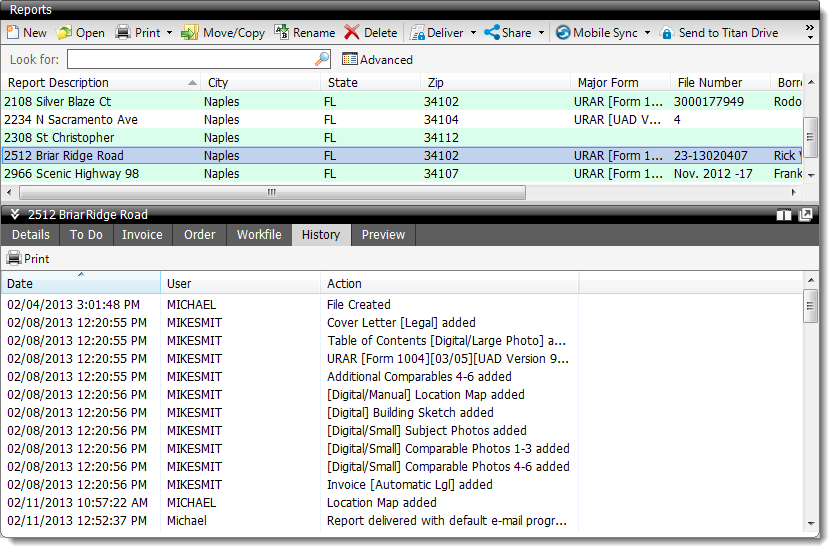 Whether you're the only appraiser working on a report, or several colleagues have assisted you, it can be a very beneficial to track each change that was made in a report, and by whom. With the Info Pane's History tab, you can quickly track what was added or deleted from a report, or verify that you actually send the report to your client. To look over a report's history, simply select the report from your list of files and click the History tab in the Appraisal Desktop's Info Pane.