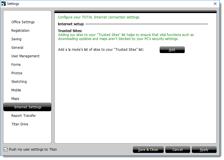 If you use antivirus or firewall software on your computer, it may attempt to block certain TOTAL processes like downloading maps. To prevent these kinds of processes from being interrupted by your antivirus or firewall software, you can have TOTAL set up a list of "trusted sites" that TOTAL must access. To set up your trusted sites: