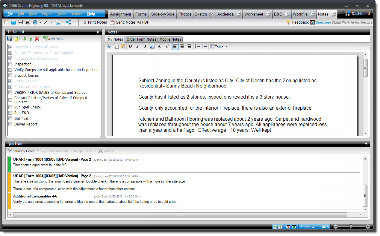 The QuickNotes panel displays any QuickNotes that have been added to your