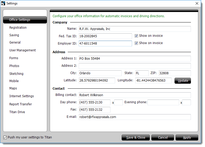 To set up your office and business information: