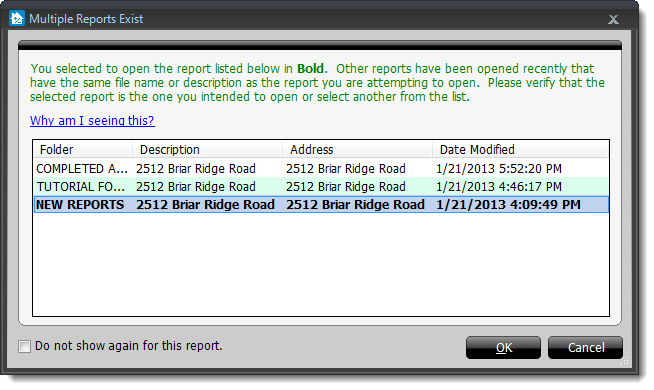 The message window that appears displays the names of the folders where the reports are located, the file descriptions, the address for each subject property, and the date that each report was last modified. The report you're currently attempting to open is highlighted and listed in bold.
