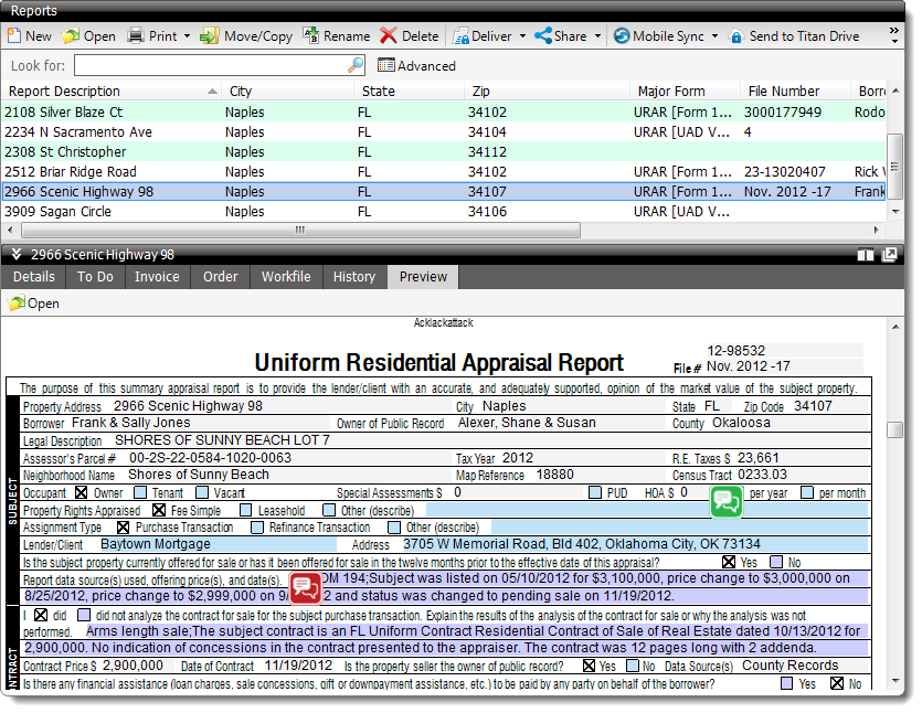 The Info Pane's Preview tab allows you to quickly view all of the forms in a report without opening each report one at a time. This way, you can easily find what you're looking for and jump from report to report. To preview a report from the Appraisal Desktop, simply select the report from your list of files and click the Preview tab in the Info Pane.