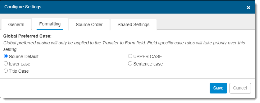 Keep in mind that changing your global preferred case changes the case preferences for all fields transferred to your report. If you want to change your case preferences for a particular field, click the link in the Data Preference Settings column to the right of the field in the Data Discrepancy view, and go to the Formatting Rules tab to change the case preferences for the selected field.