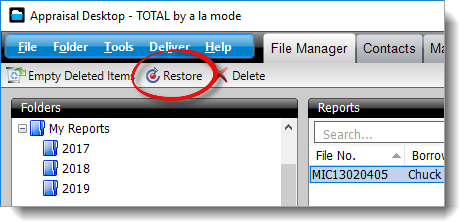 As a safeguard, TOTAL automatically stores a copy of any file that is deleted for 30 days. To view files that have been deleted, go to the Deleted Items folder at the bottom of the list of folders on the left.