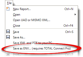 TOTAL allows you to save .ENV files to your computer. This is useful for uploading your appraisal to a portal that requires the .ENV format but is not delivered through the AppraisalPort network. To save an .ENV file to your computer:
