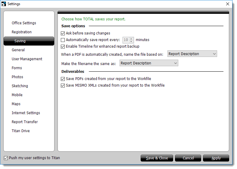 - Choose the settings you would like when TOTAL saves your report: