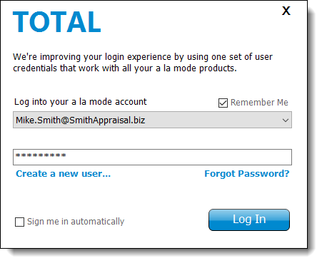When you start TOTAL, it automatically prompts you to log in using your a la mode username and password. By asking you to log in, TOTAL not only offers you extra security for sensitive information like your digital signature but also allows you the freedom to customize TOTAL without affecting other TOTAL users in your office. To sign into TOTAL:
