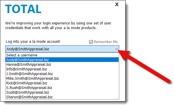 If you don't see your username in the list, make sure you've created an a la mode user profile and assigned a TOTAL seat. Click here for instructions.