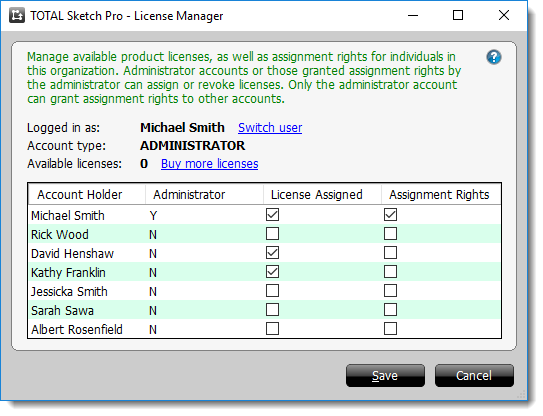 If you do not have assignment rights, contact the administrator or another user with assignment rights to assign a license to you. Assignment Rights are indicated by the checkboxes in the column on the far right.