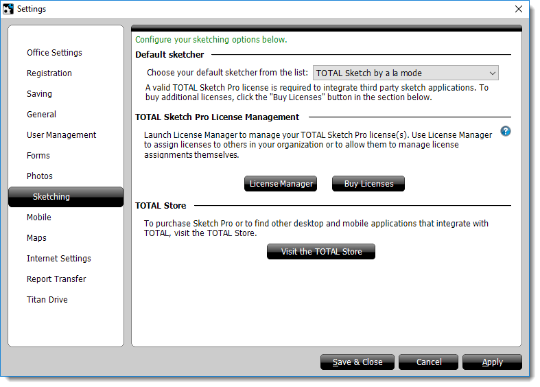 The Sketching Settings section of TOTAL's Configuration settings allows you to select your default sketcher, as well as manage any TOTAL Sketcher Pro licenses purchased through the TOTAL Store. Once you purchase a sketch license from one of the TOTAL Store's integrated merchants, quickly and easily enable TOTAL's integration with that software via the sketch configuration options.