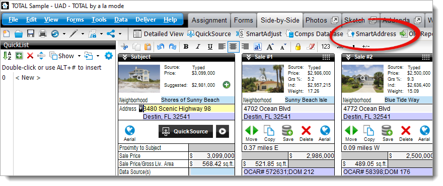 By default, when you type an address into the Side‑by‑Side grid or page 2 of the URAR, SmartAddress searches your Comps Database. It chooses the best available version (usually the most recent), and automatically fills out your grid. If you prefer to manually enter your comp data, click here to learn how to disable the auto-fill feature.