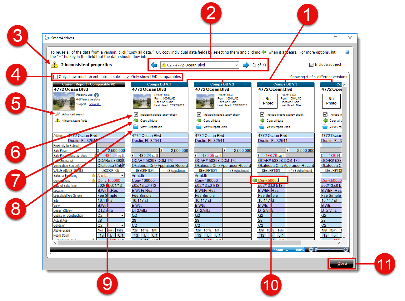SmartAddress helps you ensure you're consistent with your property data from report to report. It automatically looks for additional versions of the subject and comp addresses in your Comps Database, and displays anything that's different from the data in your report — which helps you spot discrepancies right away. It's also an amazing time‑saver, because you can simply reuse data from another version and copy it into the form in your report — not only for your comps, but for the subject address too.