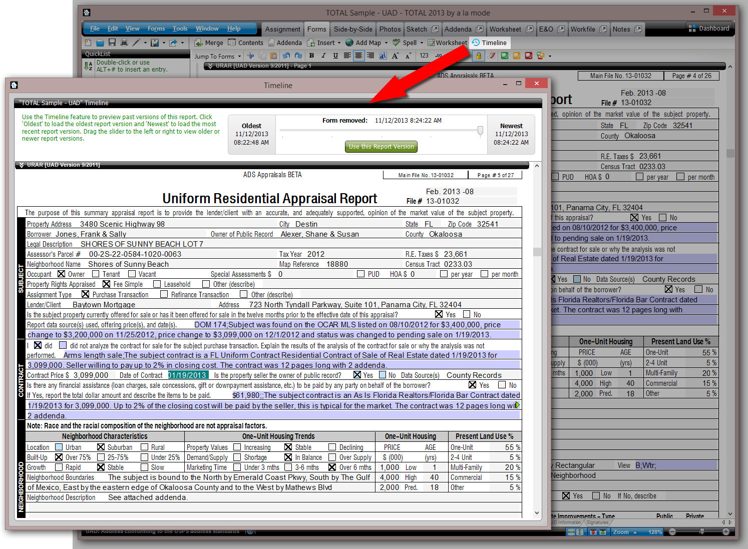 With TOTAL's Timeline feature, you're able to easily restore back to a previous version of a report. "Snapshots" of the report are generated whenever you perform tasks like merging, deleting forms, deleting comps, and more. To access Timeline, click the Timeline button on the toolbar and each snapshot is displayed on a slider with a preview of the report displayed below as you choose between snapshots. For detailed instructions on using Timeline, click here.
