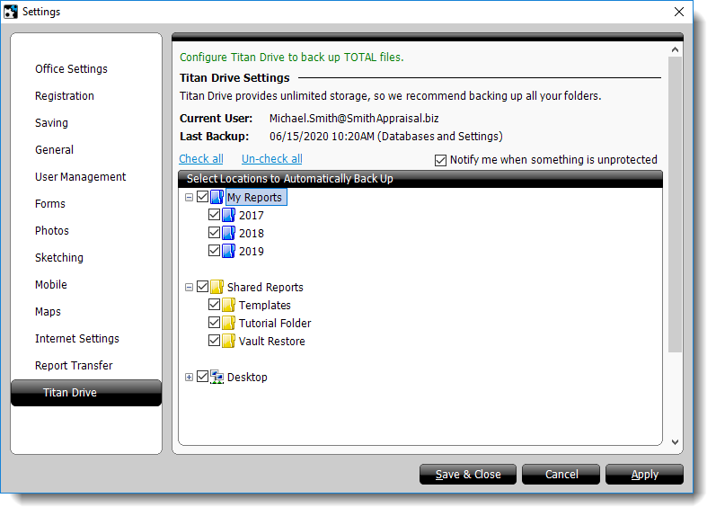 Since Titan Drive offers unlimited file storage, we strongly recommend adjusting your settings to watch all folders. This ensures nothing slips through the cracks, and you're never left in the lurch if you're away from the office and the report you need was accidentally saved in or moved to an unwatched folder.