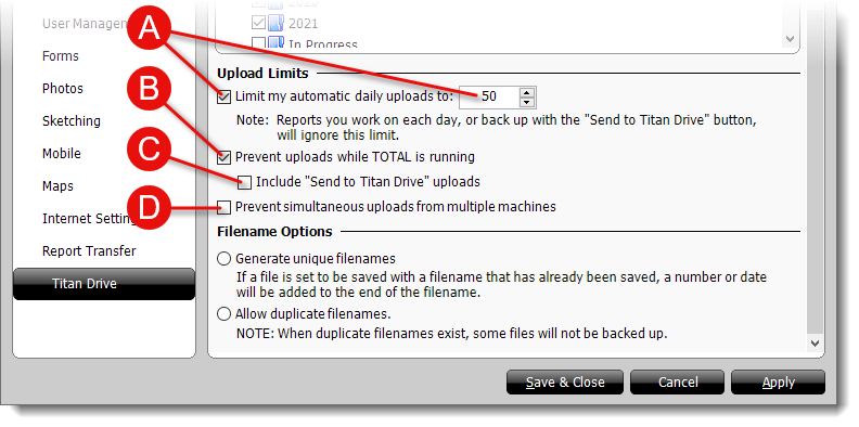 We recommend leaving this set to the default Generate unique filenames setting to ensure all of your files are backed up. If there are special circumstances, you can adjust the settings to Allow duplicate filenames. But, keep in mind that this could create a scenario where files with duplicate filenames may not be backed up and stored in Titan Drive.