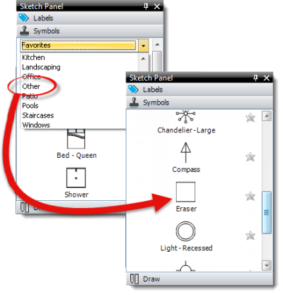 In TOTAL Sketch, you can easily erase a small segment of a line, symbol, or label using the built‑in eraser tool. The eraser tools works like digital "white out" allowing you to eliminate a small segment of a line in order to place a door in the white space, for example. To use TOTAL Sketch's eraser: