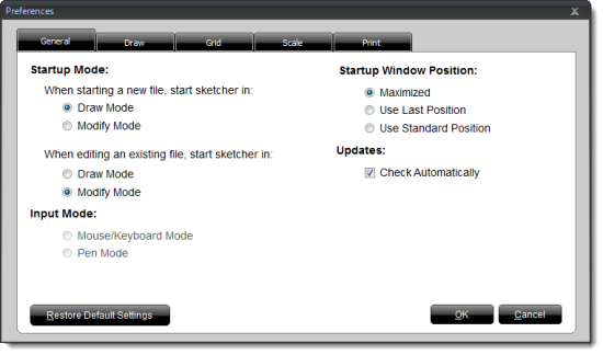 - Choose whether you want to start in Draw mode or Modify mode when opening a new