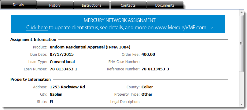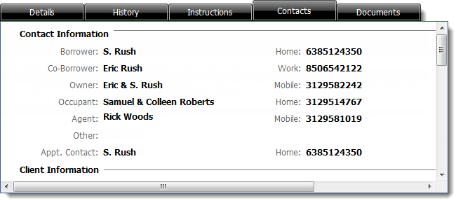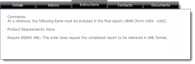 This area shows detailed information about the order, organized into tabs: