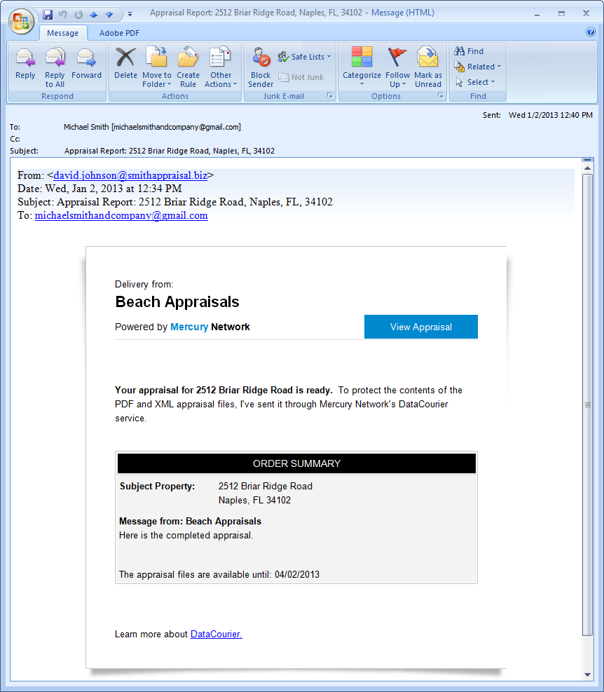 After clicking the View Appraisal link, the client is taken to a screen similar to the following. From here, they can download the MISMO XML file and/or the PDF. Even though the PDF information is embedded in the XML file, we're providing a separate link to just the PDF because many lenders and AMCs do not have tools to extract and view the PDF from the XML file.