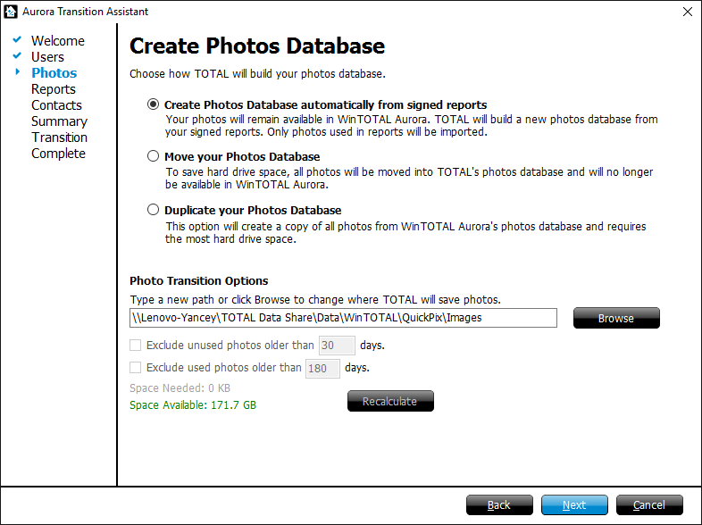 If you choose to move or duplicate your photos database, additional options are made available that allow you to exclude unused and used photos that are older than a certain number of days. Adjust these options as needed and/or click Next to continue.