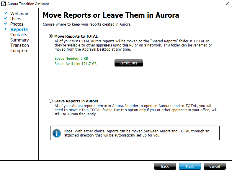 Choose whether you want to move all of your Aurora reports to the Shared Reports folder in TOTAL, or leave your reports in Aurora. If you choose to leave your reports in Aurora, you won't be able to open an Aurora report in TOTAL until you move it to a TOTAL folder. Once you've chosen to move or leave your reports, click Next.