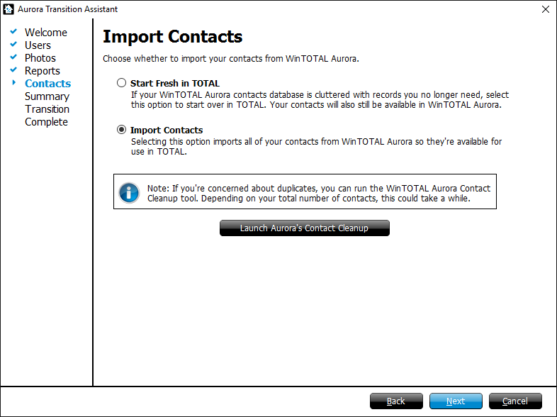 Indicate whether you want to start fresh with your contacts database in TOTAL, or if you want to import your contacts from Aurora. If you're concerned about duplicate contacts, click Launch Aurora's Contact Cleanup to run the contact cleanup wizard prior to importing your contacts. When you're finished, click Next.