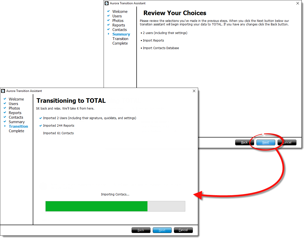 At this point, the Aurora Transition Assistant opens — guiding you through the process of copying your information over to TOTAL. Click Next to begin.