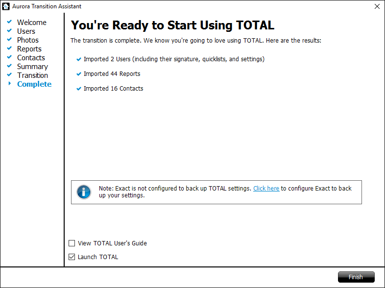 That's it! The transition to TOTAL is complete. Check the box to view the TOTAL User's Guide to continue reading about all of TOTAL's features and functionality, and/or check the box to launch TOTAL to open the Appraisal Desktop and begin using TOTAL. Then, click Finish.
