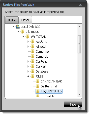 If you're saving the file(s) to your WinTOTAL Files folder, the default location is C:\a la mode\WinTOTAL\FILES. Select a folder inside of the Files folder to access the file(s) inside WinTOTAL's Appraisal Desktop. For example, select the Requests.FLD folder if you want the report(s) to show up in the New Requests folder.