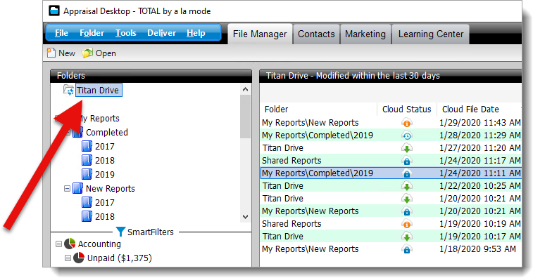 To begin working with recent reports, select Titan Drive at the top of the list of folders in TOTAL's Appraisal Desktop.